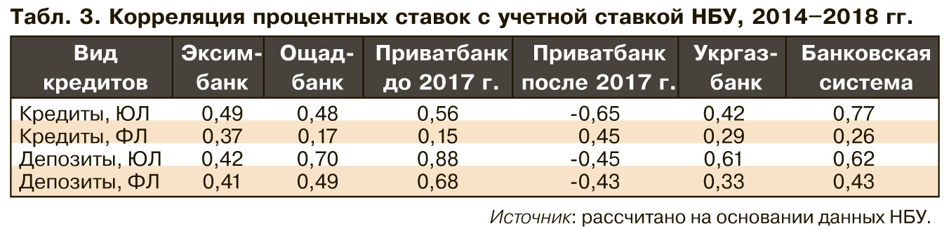 Общий уровень корреляции ставок можно считать неплохим, за исключением случая "Привата" после национализации. Также довольно неприятное явление - низкая корреляция между учетной ставкой и ставкой по кредитам физлиц. Низкие уровни корреляции для депозитов физических лиц также подтверждают уязвимость трансмиссионного механизма в аспекте влияния процентной политики центробанка на решения по потреблению и сбережениям.