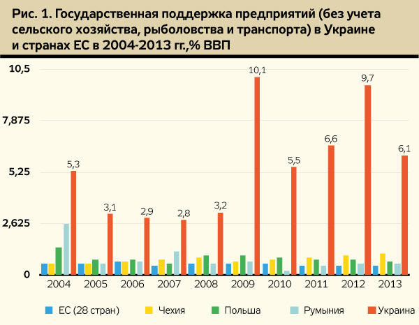В период 2004–2013 гг. государственная помощь бизнесу в Украине (в % ВВП) в несколько раз превышала аналогичные показатели в странах ЕС. Во время подготовки к вступлению в ЕС и в первые годы членства Польша (1,4% ВВП в 2004 г.), Чехия (2–3% ВВП в 2000–2004 гг.) и Румыния (1,9–2,6% ВВП в 2002–2004 гг.) имели выше средних по ЕС объемы помощи предприятиям, однако ниже, чем в Украине. Если госпомощь предприятиям в среднем по ЕС оставалась почти неизменной, то в нашей стране наблюдалась тенденция к ее росту.