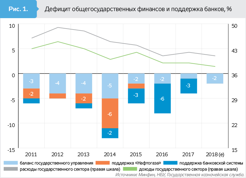 На протяжении кризиса 2008–2009 гг. для поддержки банков государство потратило сумму, эквивалентную 3,7% ВВП. И даже после кризиса (2010–2013 гг.), пытаясь удержать госбанки на плаву, докапитализировало их на 1,5% ВВП. В течение 2014–2017 гг. в государственные банки (включая спасение Приватбанка) было влито 207 млрд грн, или 8,7% ВВП.