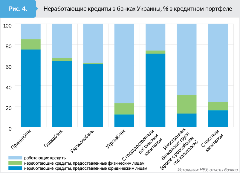 Намного лучше выглядит ситуация в Укргазбанке, где функционирует наблюдательный совет: проблемные кредиты там даже меньше, чем в иностранных банках, и докапитализация была небольшой. Приватбанк - частный случай, там большинство неработающих кредитов связано с компаниями бывших акционеров и является результатом скорее слабого надзора со стороны НБУ в годы до национализации, чем правительственной политики. А вот в Ощадбанке и Укрэксимбанке ситуация ужасающая почти настолько же, как в портфелях российских госбанков: 60–70% кредитов - плохие.