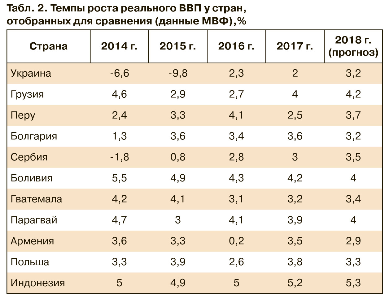 Украина с ее в среднем за последние десять лет 45% (что очень близко к уровню 2017 г.) оказалась по соседству с Германией, Великобританией и Норвегией. Правда, у Сербии очень близкие показатели. Но и Болгария с Румынией, и Литва, и даже Канада имеют значительно меньшие правительства - при том, что в Болгарии и Литве больше людей преклонного возраста. Ни одна из стран, перераспределяющих через публичные финансы больше, чем мы, не является настолько же бедной, кроме разве что южноафриканской Лесото и нескольких островных мини-государств. Такая же безрадостная картина и с государственным управлением: Украина не просто размещается в наименее удачном втором квадранте (страны с большим размером государства и при этом плохим управлением), но и отстоит от линии тренда едва ли не дальше всех. Если не считать разрушенных войной Ирака и Сирии, то нас опередили только упомянутая Лесото и Беларусь (очевидно, из-за недемократичности), ну и очень недалеко оказались Босния и Герцеговина и Сербия. С учетом этого понятно, почему наша страна, несмотря на большой потенциал, отстает в темпах экономического роста (табл. 2).