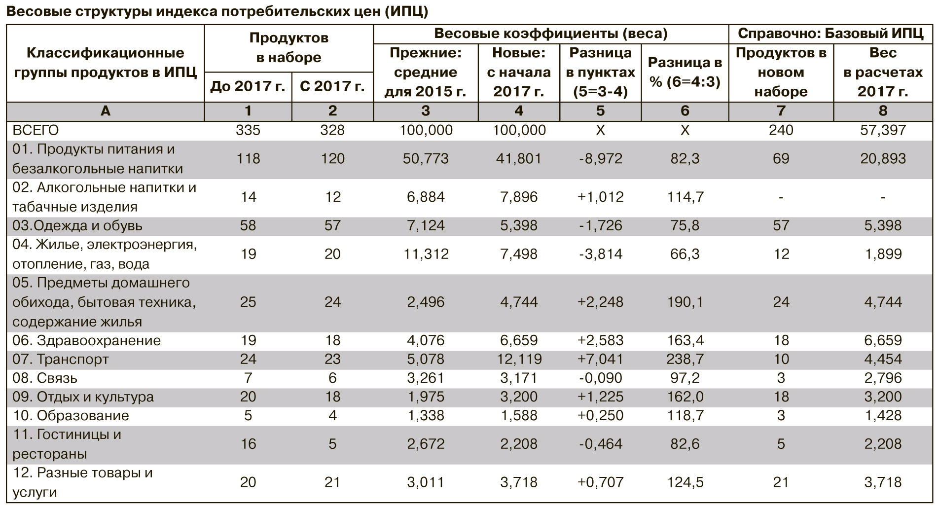 В обычных условиях основное влияние на изменение ИПЦ оказывает динамика индивидуальных цен продуктового набора, а ежегодные изменения весовой структуры невелики и плавны. И они лишь незначительно могут влиять на изменение общего показателя. Но начиная с января 2017-го была существенно изменена весовая система индекса, что довольно ощутимо повлияло на результаты его расчетов.