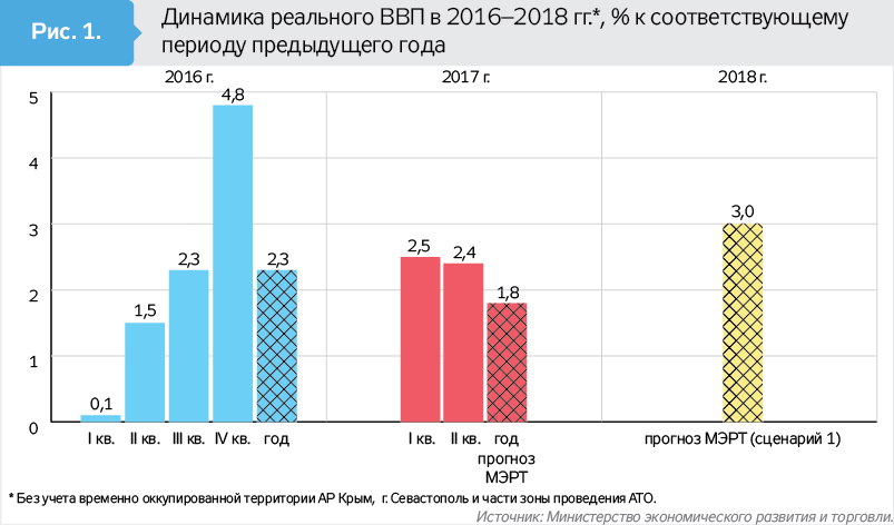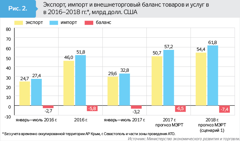 Из приведенных рис. 1 и 2 следует, что рост нашей национальной экономики в 2017 г. составит менее 2%, на 2018-й прогноз менее 3%. Украина также имеет отрицательный торговый баланс. Причем наш экспорт - это в основном природные ресурсы. Сюда же стоит добавить отток рабочей силы на уровне 2 млн человек за последние несколько лет, которая является наиболее ценным ресурсом для любого государства. И все это на фоне ежегодного бегства капитала на уровне 11 млрд долл. в год.