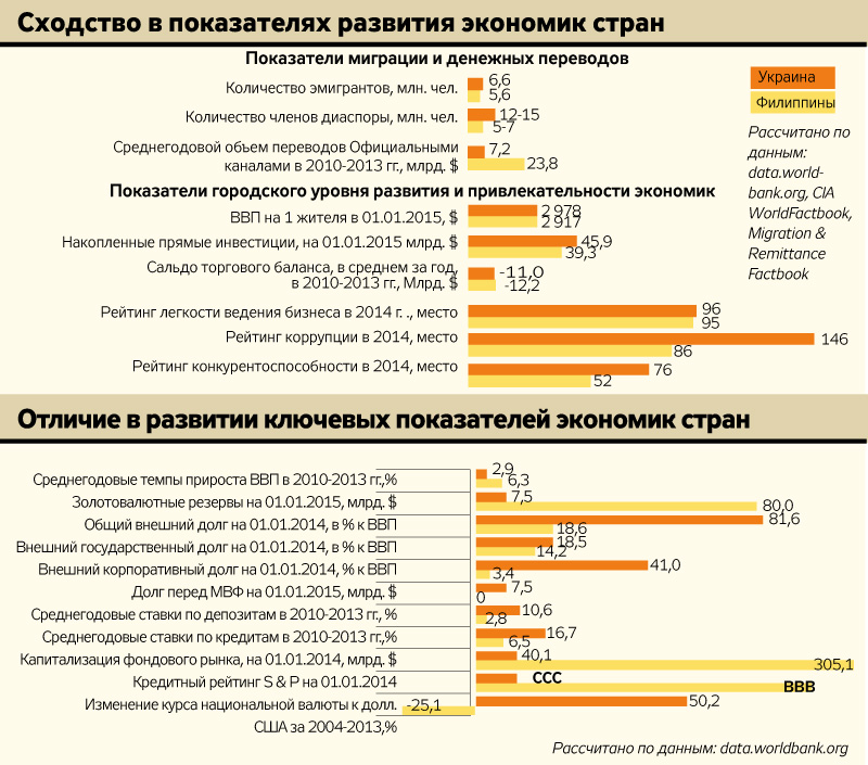 На сегодняшний день таким успешным путем идут ряд стран Юго-Восточной Азии, в частности Филиппины. На примере этой страны ZN.UA уже рассказывало ("Миграционный клондайк для Украины", ZN.UA от 15 ноября 2013 г.) о больших возможностях развития и для нашей за счет привлечения денежных переводов мигрантов. На протяжении марта 2015 г. по приглашению Азиатского банка развития автор непосредственно изучал государственную и финансово-банковскую политику в отношении мигрантов на Филиппинах. Опыт показал, что в значительной степени благодаря денежным переводам власть этой страны смогла построить очень стабильную экономику, по многим показателям (уровню госдолга, золотовалютным резервам, кредитному рейтингу, депозитным ставкам) полностью отвечающую развитым странам и даже ставшую кредитором МВФ.