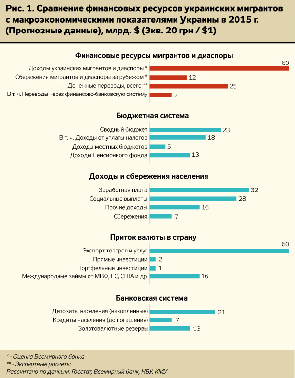 Филиппинский опыт очень важен для нас, ведь финансовые ресурсы мигрантов имеют большой потенциал для отечественных экономики и домохозяйств. Об этом свидетельствует сравнение их объемов с ключевыми макроэкономическими показателями. Вместе с тем Украина - одна из немногих стран, у которой значительное количество мигрантов за рубежом (по данным Всемирного банка, около 6 млн чел.) и у которой практически отсутствует государственная, финансово-банковская политика привлечения их доходов и сбережений в экономику. Из-за отсутствия такой политики объемы переводов через банки составляют лишь около 7 млрд долл. в год. Еще около 15–17 млрд поступают по неофициальным каналам, обходя банковскую систему, и не учитываются в платежном балансе страны.
