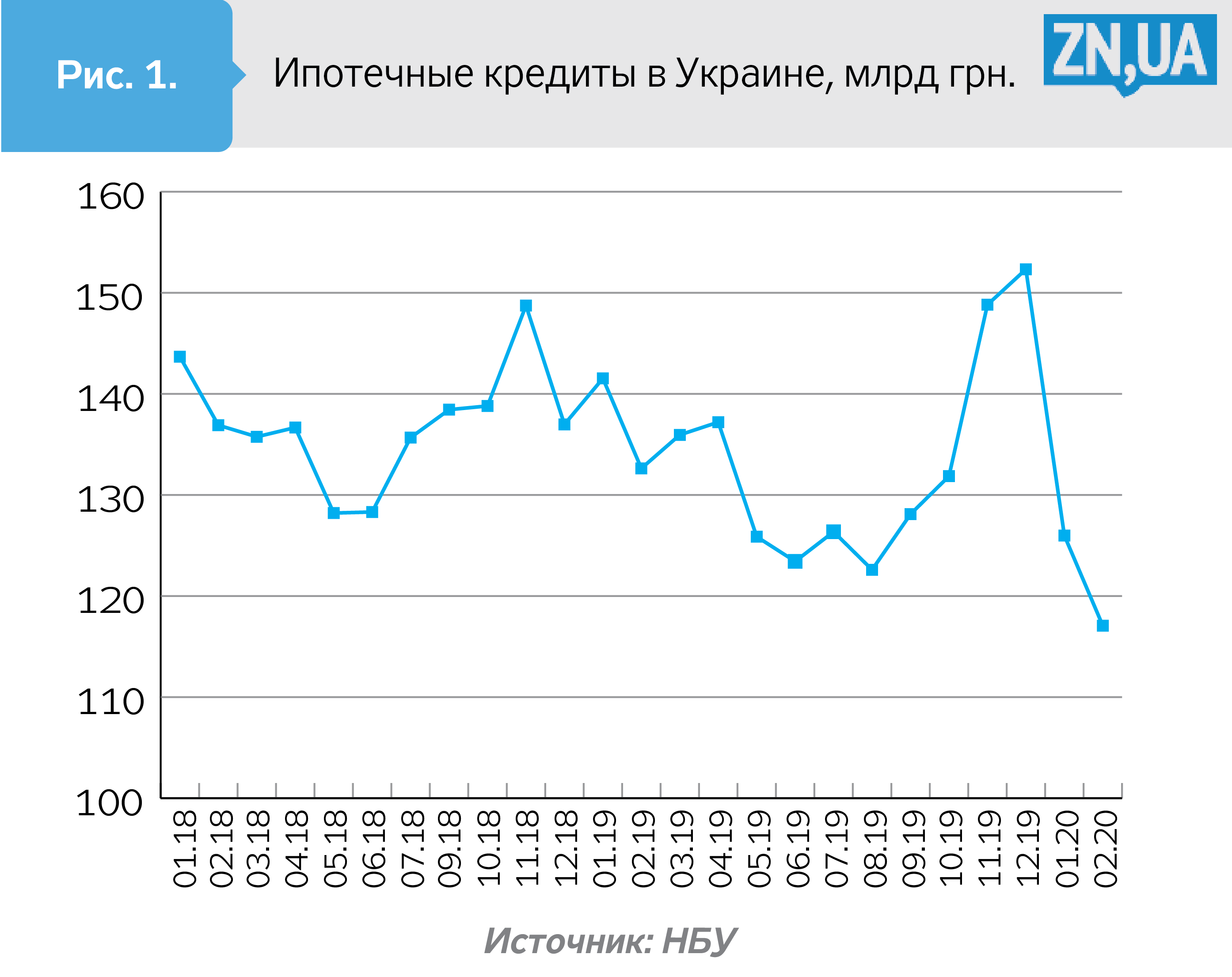 Следует отметить, что ипотечное кредитование в 2019-м по сравнению с предыдущим годом уменьшилось на 11%, или на 15,5 млрд грн (на 1 января 2020-го - 126 млрд грн, на 1 января 2019-го - 141,5 млрд). Причин этого несколько, в том числе зависящих от НБУ. Вот о них и путях их устранения мы поговорим ниже. Но можно констатировать: ипотечное кредитование в Украине в последние годы не развивается, можно даже сказать - деградирует (см. рис. 1).