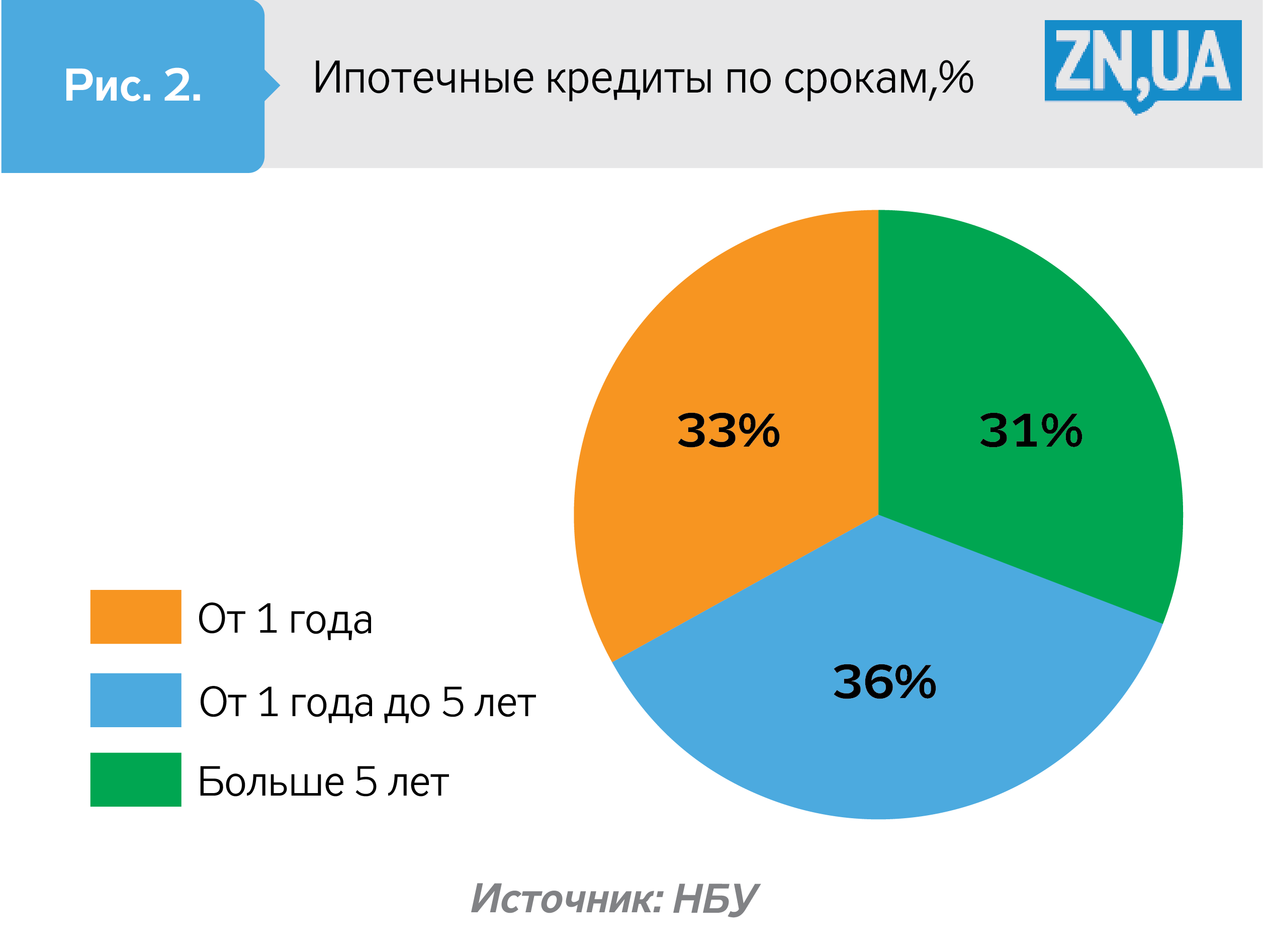 Уровень проникновения ипотеки в Украине составляет менее 4% от ВВП и продолжает снижаться. При этом доля долгосрочных кредитов (свыше пяти лет) составляет менее трети от и без того мизерного объема ипотечных кредитов (см. рис. 2).