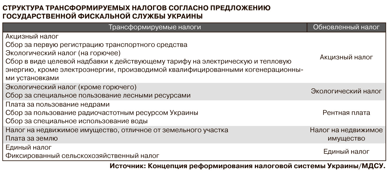 Но именно странный вопрос, который вынесен в заголовок статьи, приходит в голову после ознакомления с конспективным слайдом-содержанием Концепции реформирования налоговой системы Украины на сайте реорганизованного Министерства доходов и сборов Украины (МДСУ). Ведомство презентовало коренную перестройку существующей структуры налогов, в том числе экологического, некоторых ресурсных и рентных платежей, утвержденных Налоговым кодексом Украины (см. табл.).