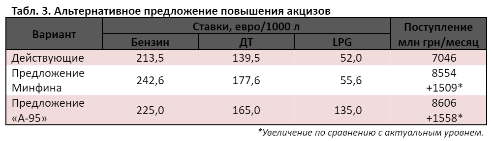 Энергетическая ценность сжиженного газа на 20% меньше «бензиновой», то есть его расход пропорционально больше. С учетом также дополнительных затрат, обоснованной выглядит ставка акциза на уровне 65% от акциза на бензин. В нашем случае это 135 евро/1000 л (см. табл. 3). Такая пропорция новых акцизов дает в сумме такой же результат, как и минфиновская, но опирается на реальную картину рынка и его возможностей.