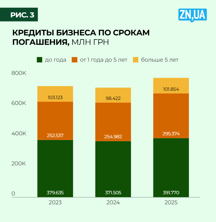 Настораживает вот какой тренд: наиболее популярны займы на срок до одного года. Тренд этот прочно зафиксировался и не хочет разворачиваться в сторону долгосрочного кредитования, несмотря на декларируемый оптимизм: в 2023-м 51,6% выданных кредитов были на срок до одного года, в 2025-м их же 49,6% (см. рис. 3). Вряд ли такую мизерную, хоть и позитивную динамику можно всерьез считать сломом тренда.