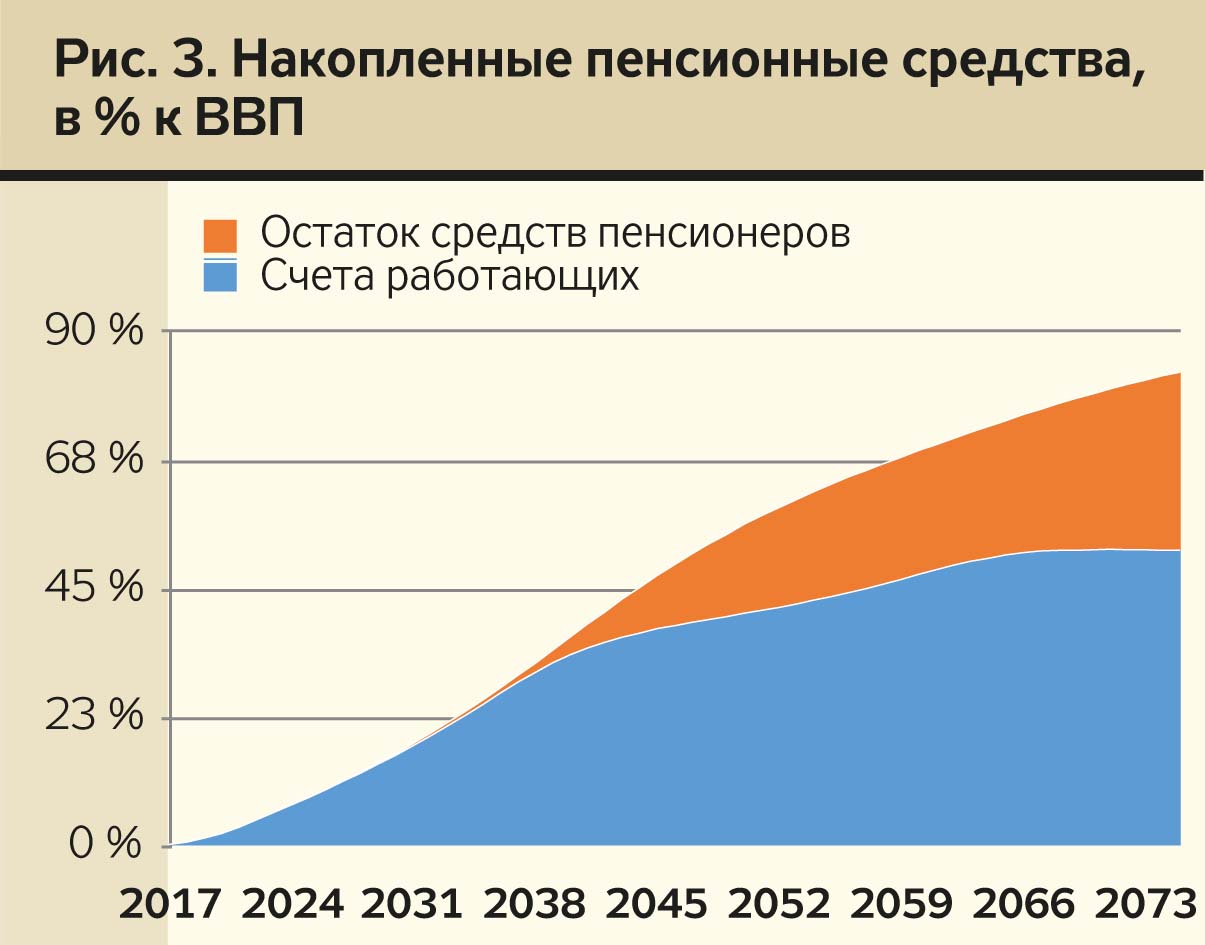 При условии обеспечения прогнозируемого уровня реальной "чистой" инвестиционной доходности пенсионных активов (+2% свыше покрытия инфляции и расходов на администрирование) во второй половине 2040-х годов суммарный объем накопленных пенсионных средств превысит 50% ВВП, а в конце прогнозируемого периода достигнет 83% ВВП (рис. 3). Это средства, которые действительно можно будет инвестировать в развитие страны. Но существует несколько обстоятельств, на которые стоит обратить внимание.