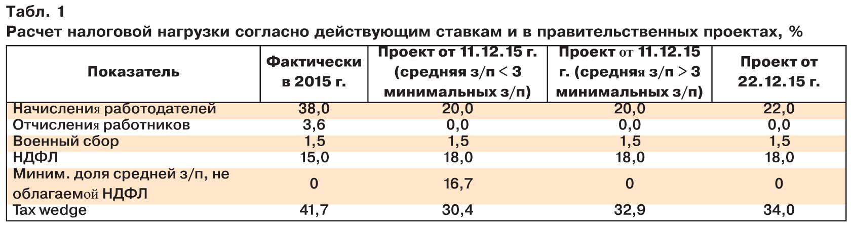(2 или 3,6%), а также повышение ставки налога на доходы физических лиц до 18%. Также предполагалось увеличить количество работников, которые смогли бы получать социальную льготу, на размер которой уменьшается база налогообложения НДФЛ. Социальная льгота устанавливалась в размере 50% минимальной заработной платы для всех работников, чьи доходы не превышали трехкратного размера минимальной зарплаты, действовавшей на начало соответствующего года (в действующем законодательстве - в 1,4 раза).