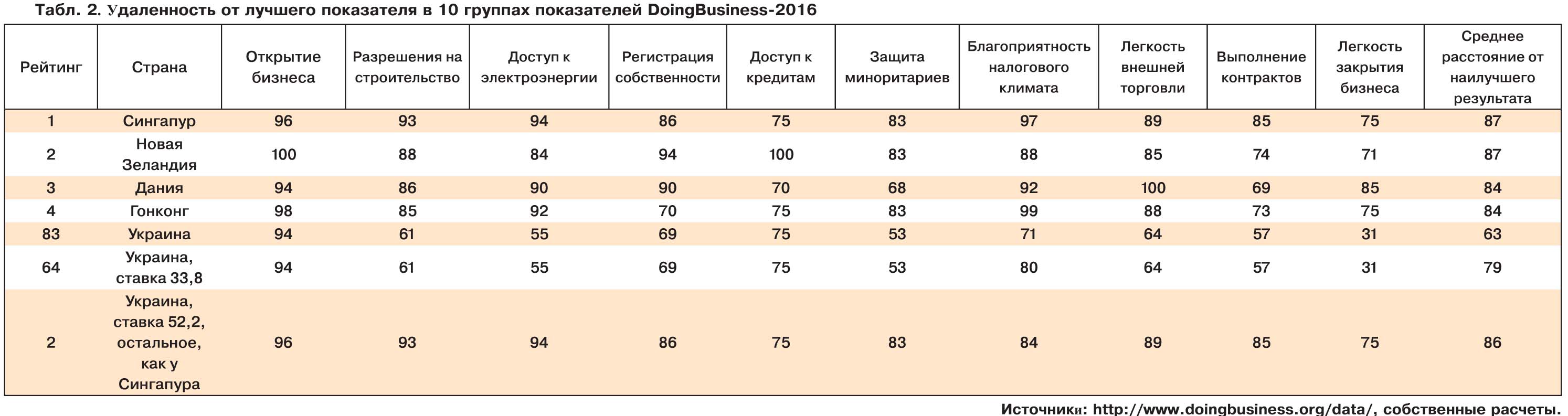Для того чтобы проверить, насколько чрезмерная налоговая нагрузка влияет на инвестиционную привлекательность стран и деловой климат, обратимся к уже известному в Украине показателю Всемирного банка Doing Business. Он определяется, исходя из десяти равнозначных групп показателей, приведенных в табл. 2 (см. на сайте ZN.UA). В 2016 г. среди 189 стран и отдельных городов Украина заняла 83-е место, набрав 63 балла из 100. Методика рейтингования предполагает определение удаленности конкурентоспособности определенной страны от лучшего показателя в разрезе 36 индикаторов. Эти индикаторы объединены в 10 групп и равномерно влияют на показатель каждой из них. Как видно из табл. 2, к сегментам, превышающим средний результат (63 балла), относятся: а) основание бизнеса - 94 балла из 100; б) как ни странно, возможности кредитования - 75 баллов; в) даже злосчастный налоговый климат - 71 балл; г) регистрация собственности - 69 баллов.