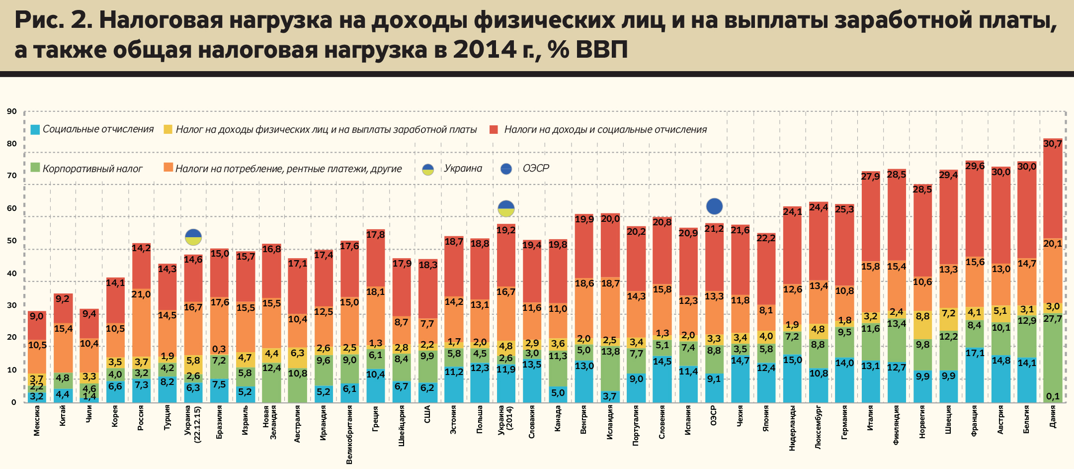 Чрезмерное налогообложение и конкурентоспособность. Согласно методике Doing Business (DB), в 2015 г. средняя налоговая нагрузка в Украине составляла 52,2% от прибыли предприятий - 30-е место среди 189 стран. Но в методике DB учитываются только два вида налогов и сборов - налог на прибыль предприятий и ЕСВ, которые платят работодатели. Поскольку ставка ЕСВ в Украине очень высокая, то и уровень налоговой нагрузки согласно этой методике соответствующий (см. рис.1 на сайте ZN.UA).
