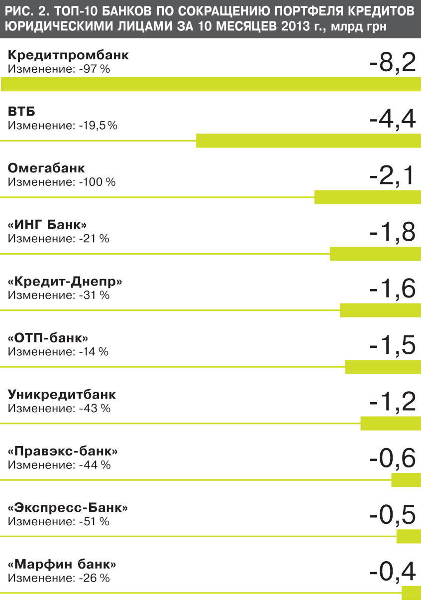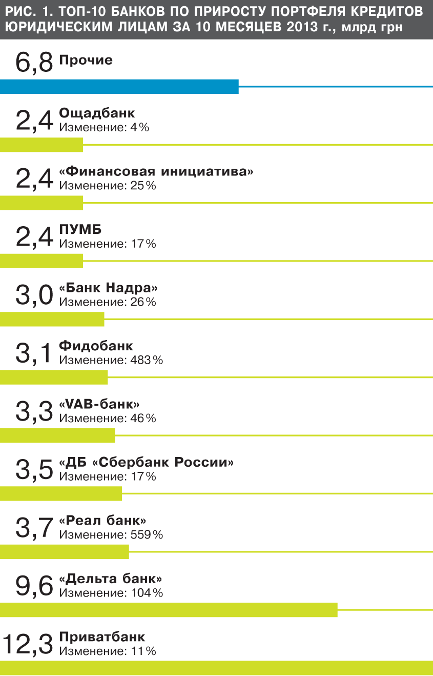 К концу 2013 г. карта финансового рынка кардинально поменялась - среди десяти наиболее успешных игроков нет ни одного (!) банка с иностранным капиталом. При этом потерялись и "госы" - среди десятки банков, наиболее активно наращивающих кредитный портфель, оказался только Ощадбанк с самым скромным приростом в 4% (см. рис. 1, 2 на 10-й стр.). Лидеры по относительным темпам роста - принадлежащий С.Курченко "Реал банк" (559% прироста кредитного портфеля) и Фидобанк А.Адарича (+483%).