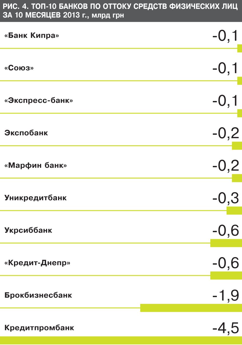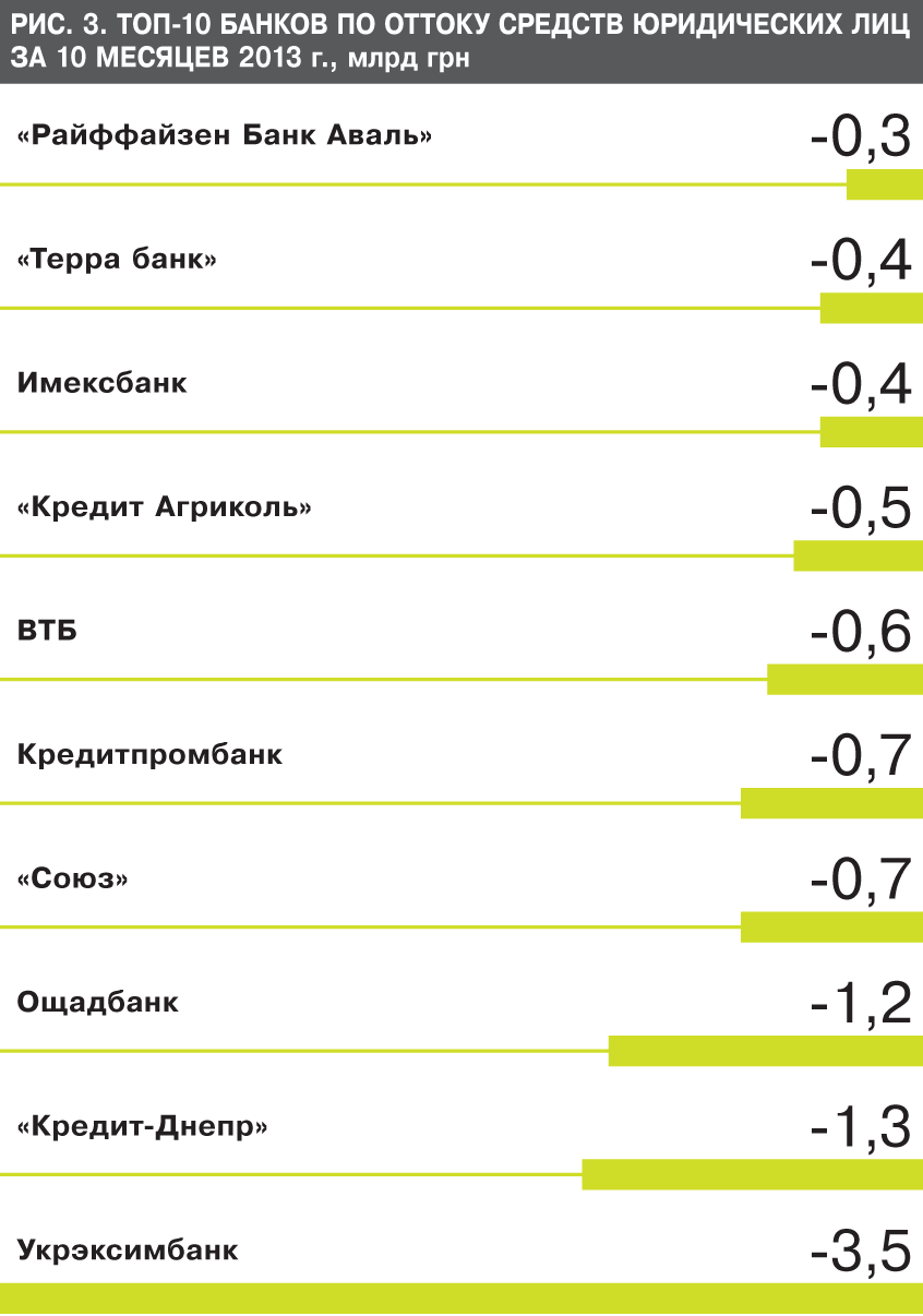 Впрочем, нелегко придется и многим другим участникам рынка, не участвующим в схемных операциях либо сделках по скупке других финучреждений. В этом году фактические остатки по пассивам юридических лиц в гривне падают. Причем теряют их недавние лидеры рынка. Так, ТОП по потере средств бизнеса возглавляют Укрэксимбанк (3,5 млрд грн), "Кредит-Днепр" (1,3 млрд), Ощадбанк (1,2 млрд), банк "Союз" (0,7 млрд грн). Потеряли деньги юрлиц "ВТБ Банк", "Креди Агриколь", "Райффайзен Банк Аваль" (рис. 3).
