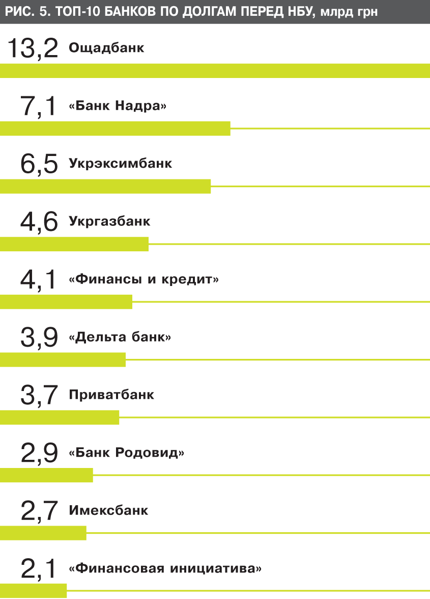 Еще один вопрос для регулятора - в целесообразности стабилизационного рефинансирования для банков, которые так активно выдают займы в рынок. К примеру, у "Финансовой инициативы" в пассиве 2,1 млрд грн задолженности регулятору (за десять месяцев погашено 0,6 млрд), у Приватбанка - 3,7 млрд грн (за десять месяцев погашен 1 млрд), у "Дельта банка" - 3,9 млрд грн (за десять месяцев долг увеличен на 0,7 млрд). А вот задолженность "Банка Надра" Дмитрия Фирташа не менялась с начала кризиса и составляет 7,1 млрд грн (погашений в этом году не осуществлял).