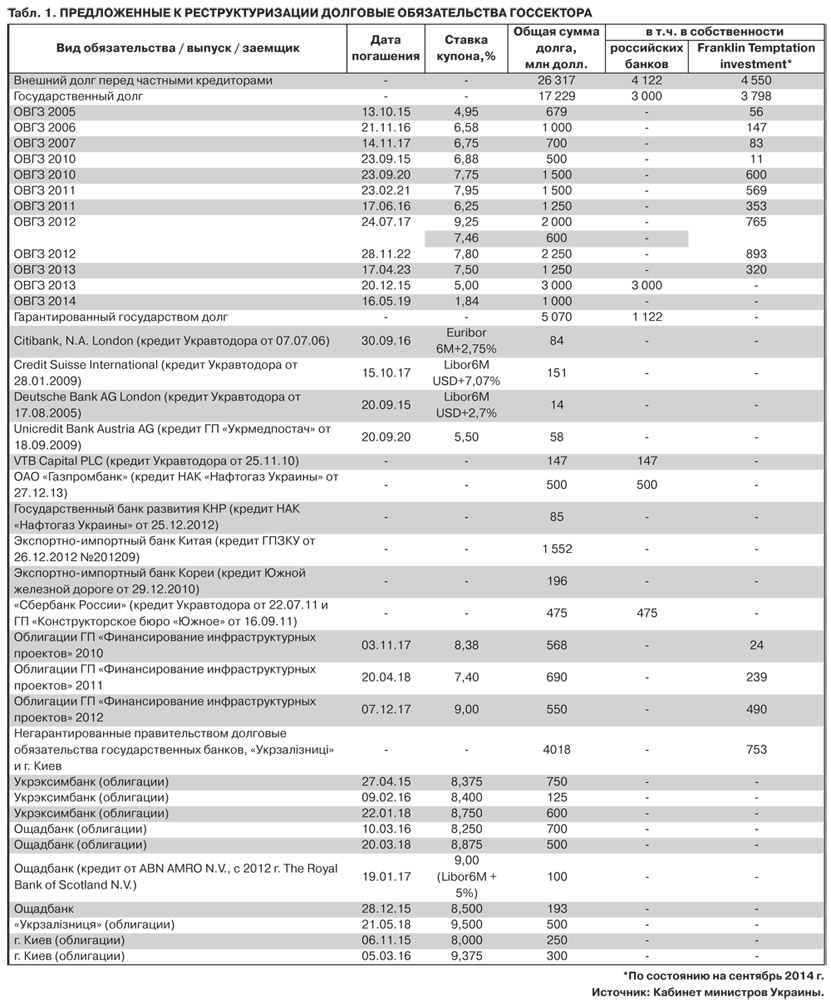 Крупнейшим владельцем правительственных и гарантированных правительством еврооблигаций является хедж-фонд Franklin Templeton, имеющий блокирующий пакет в семи выпусках еврооблигаций. В печати были сообщения, что этот хедж-фонд является владельцем портфеля из суверенных долговых обязательств Украины на сумму до 7 млрд долл. Однако в обнародованной отчетности Franklin Templeton фигурирует несколько иная сумма - свыше 4 млрд, или 21% от всего объема задолженности перед частными кредиторами. Как бы там ни было, но с рядом других хедж-фондов (PIMCO, Blackrock, Fidelity и Stone Harbor) Franklin Templeton контролирует более 50% задолженности перед рыночными кредиторами.