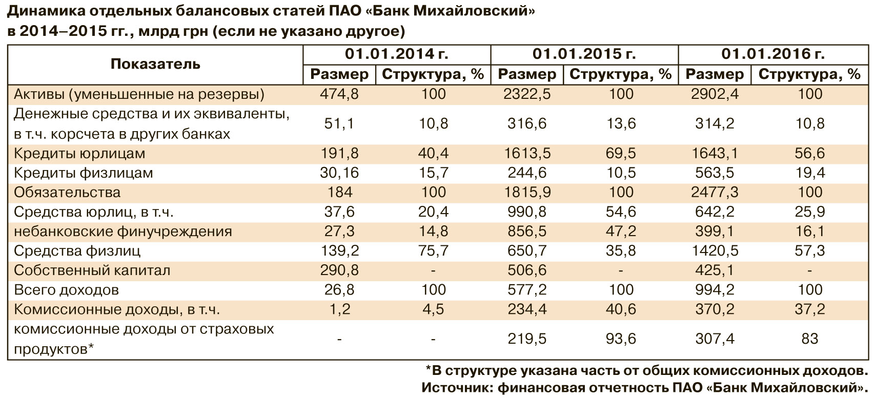 Аналогичная ситуация наблюдается при углубленном анализе отчетности банка "Михайловский". Это банковское учреждение начало свою деятельность в 2013-м. В партнеры основного собственника банка, В.Полищука, СМИ записывали и беглого главу Минсдоха А.Клименко, и топ-менеджеров регулятора. "Михайловский" изначально позиционировался как специализированный банк для потребительского кредитования, активно привлекающий для этого депозиты населения. Но у дотошных аналитиков при первом знакомстве с его финотчетностью сразу возникает вопрос о причинах существенной доли корпоративного кредитного портфеля в его активах. Нижеприведенный анализ наглядно демонстрирует, что в кризисные 2014–2015 гг. у банка "Михайловский" происходили значительные изменения в структуре активов и пассивов (см. табл.).