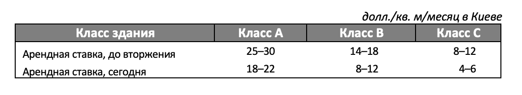 И хотя в первые месяцы вторжения арендные ставки были на уровне 10–15% от аналогичных до начала военных действий, на сегодняшний день они составляют 50–70% от прошлогодних. В таблице приведены офисные ставки до вторжения и по состоянию на декабрь 2022 года.