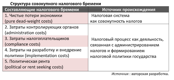Общеизвестно, что налоговая нагрузка рассматривается как отношение налоговых обязательств к базе налогообложения. Этот показатель может рассчитываться как на макро-, так и на микроуровне. Все знают, что налоговый коэффициент в Украине составляет около 35% ВВП. Это и есть первая составляющая налогового бремени. Вместе с этим существуют еще затраты администрирования налогов контролирующими органами (administration costs), затраты на соблюдение налогового законодательства налогоплательщиками (compliance costs), затраты на разработку и имплементацию налогового законодательства (implementation costs), политическая рента (political or rent seeking costs). Наглядно все это можно себе представить в виде таблицы (см. ниже). Следует отметить, что последняя величина в странах со значительными масштабами коррупции, клептократической элитой и слабым государством может быть достаточно весомой как в абсолютном, так и в относительном выражении. И где ее искать, все знают, как с этим бороться, тоже, но часто не хватает ни желания, ни политической воли.
