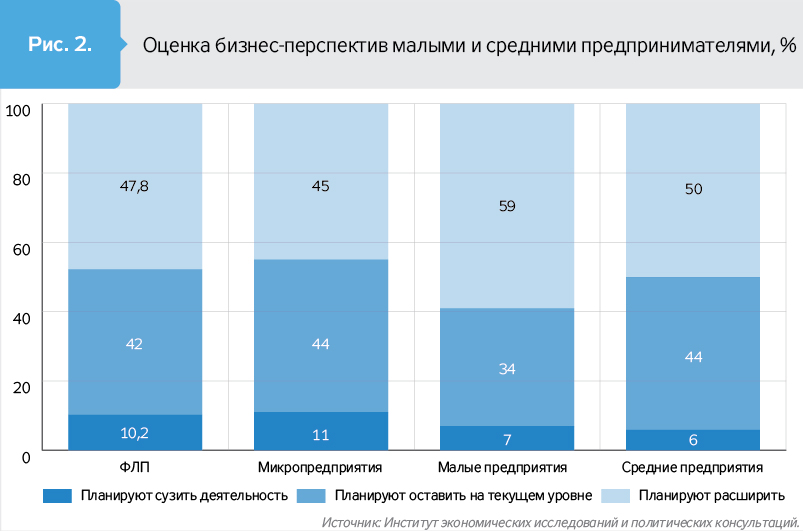 Несмотря на все проблемы, МСП оптимистичны в своих производственных планах - 47,8% намерены расширить деятельность на протяжении следующих двух лет и только 10,2% ожидают сокращения объемов в такой перспективе. К слову, это лучшие из всех ожиданий, измеряемых в этом исследовании, и тенденция имеет признаки устойчивости. Так, в первой волне "оптимисты" также существенно преобладали над "пессимистами": 53% МСП планировали расширить деятельность в двухлетней перспективе, а 8% - сократить. Малые и средние предприятия демонстрируют наибольший оптимизм. Здесь придирчивый читатель может заметить, что баланс долгосрочного оптимизма несколько ухудшился во второй волне исследования по сравнению с первой: было +45, а стало +38. Это действительно так, долгосрочный оптимизм несколько снизился, и этому есть объяснение, о чем ниже. Но констатируем факт: бизнес-климат, по ощущениям МСП, постепенно, но улучшается.