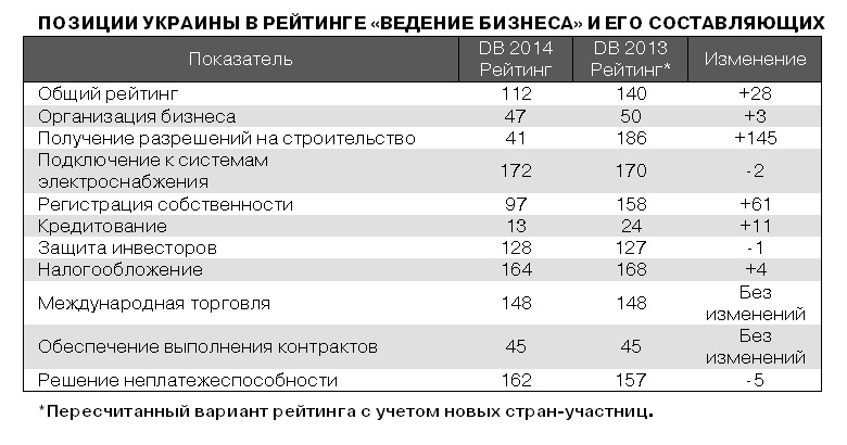 В опубликованном на нынешней неделе в Вашингтоне рейтинге DoingBusiness-2014 группы Всемирного банка Украина улучшила свои позиции по сравнению с прошлогодними показателями сразу на 28 пунктов, переместившись на 112-ю позицию. Более того, наша страна названа в исследовании топ-реформатором - улучшения регуляторной среды были засчитаны составителями исследования в восьми сферах из десяти отслеживаемых: получении разрешений на строительство, создании предприятий, регистрации собственности, налогообложении, внешней торговле, подключении к энергоснабжению, получении кредитов и разрешении неплатежеспособности.