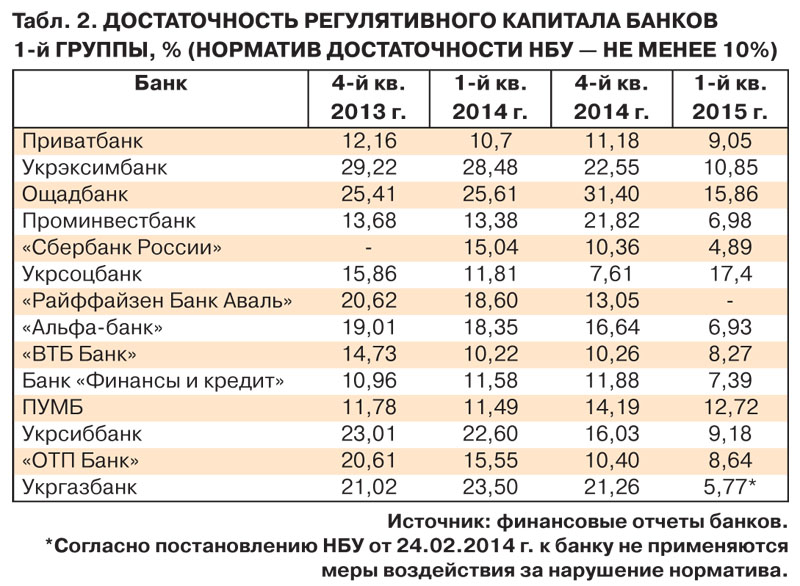 Другие крупнейшие игроки тоже не могут похвастаться какими-либо особенно положительными тенденциями - у девяти из четырнадцати банков первой группы достаточность капитала ниже минимально допустимого норматива регулятора (10%, табл. 2).