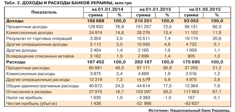 Компенсаторов в доходной части пока не просматривается. Традиционно основу банковских поступлений в Украине составляли именно процентные доходы от кредитных операций (70–80%). Однако в нынешнем году этот показатель снизился до всего лишь 55–60% (табл. 3). Предопределили эту тенденцию, помимо девальвации национальной валюты, катастрофическое падение экономики, сокращение объемов производства и переход в категорию убыточных большинства традиционных бизнесов, а как следствие - ухудшение обслуживания заемщиками их кредитов. Токсичные активы банков, львиная доля которых, к тому же, сформирована за счет сомнительных операций со связанными лицами (фактически кредитованием бизнесов собственников), быстро достигли критической массы. В итоге много лет прятавшееся в дебрях банковских отчетов и проводок реальное положение дел вылезло наружу - даже по оценкам НБУ, уровень проблемных кредитов в банковской системе превышает 50%.