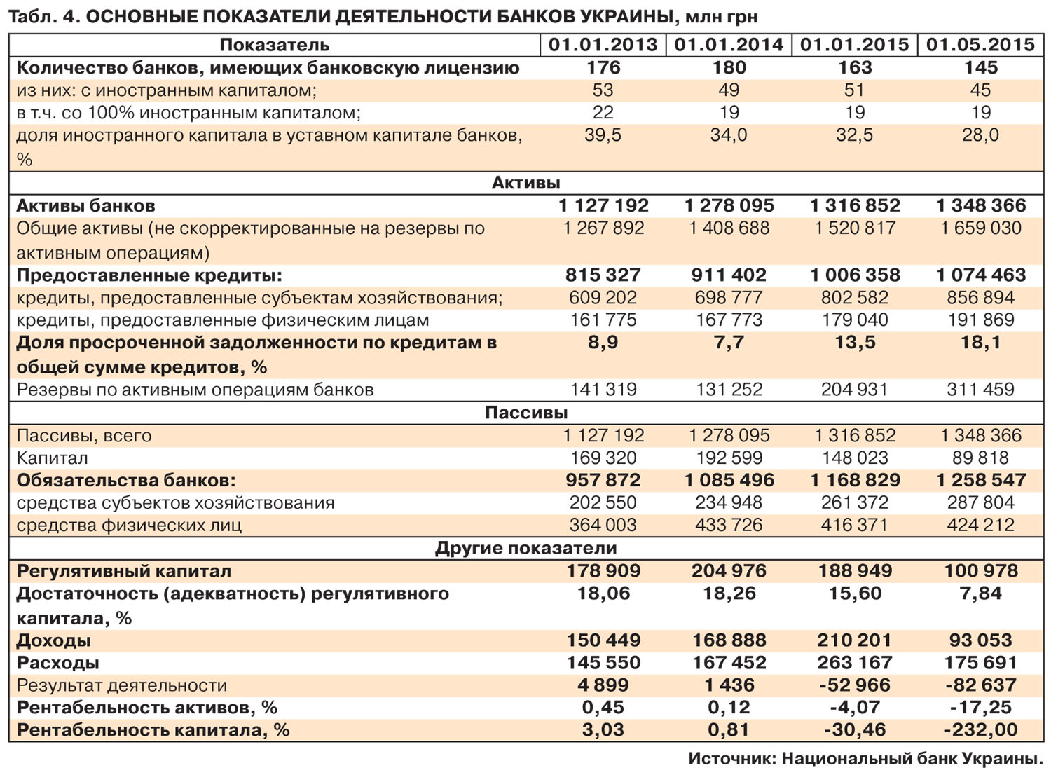 Впрочем, доля официальной "просрочки", по нацбанковским данным (табл.4), составляет всего 18%, а в предыдущие годы с высочайшего соизволения чиновников банковского регулятора рисовался внешне еще значительно более благопристойный показатель (до 10%), а явный диссонанс с международными оценками уровня токсичности активов объяснялся "различиями методологии". Кстати говоря, и сегодня "дочки" международных финансовых групп показывают в своей отчетности намного более печальные цифры "проблемки" в балансах, нежели их местные или российские визави. Так, у "дочки" итальянской Unicredit Укрсоцбанка неработающие кредиты (NPLs - с просрочкой более 90 дней) и реструктуризированные ссуды на конец первого квартала 2015 г. составляли около 80% портфеля.