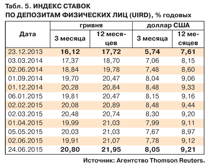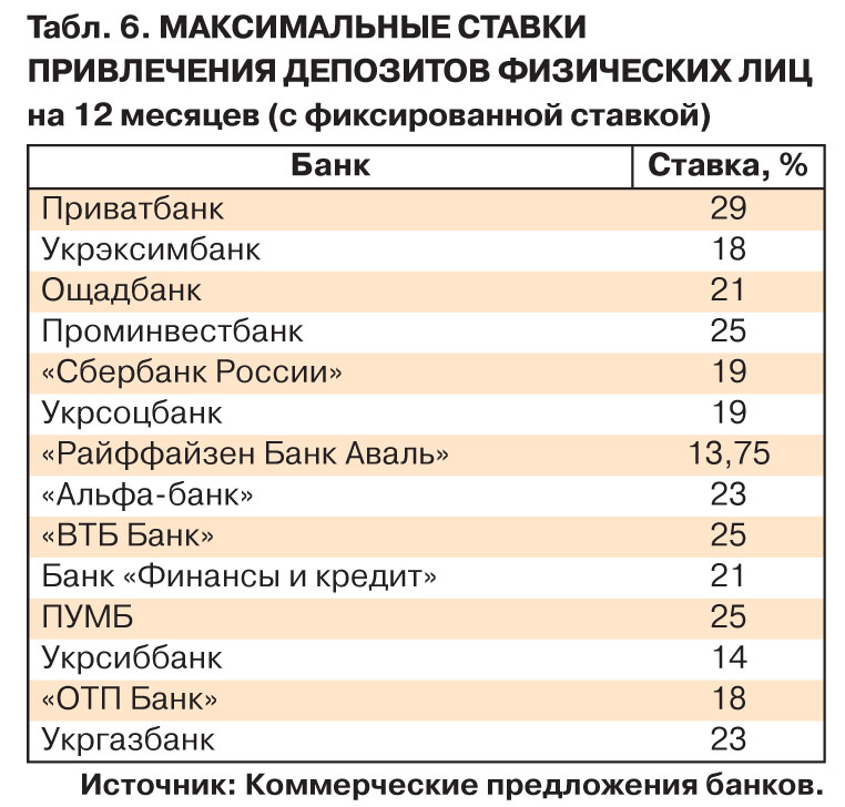 Полтора года назад, повышая стоимость привлечения денег, банкиры объясняли, мол, мера временная, мы видим отток, его нужно остановить, рынок нужно успокоить, мотивируем вкладчиков "гривней". Некоторые даже придумывали сезонные продукты а-ля "шалена весна", "спекотне літо", намекая, что вот, смотрите, не успеете сейчас положить под 20% годовых, потеряете невиданную возможность. Но весну с летом сменили осень и зима, пришли новая весна, и новое лето, а стоимость привлечения вкладов неумолимо растет и дальше. И утраченная прошлым летом возможность положить под 20% этим летом уже не кажется такой привлекательной. Индекс ставок по депозитам физлиц (рассчитывается исходя из "классических" депозитов 20 ведущих комбанков Украины) на 24 июня составил почти 22% для годовых гривневых вкладов и 20,8% - для трехмесячных (табл. 5). Это, грубо говоря, средняя температура по палате, на рынке есть депозиты и по 25%, и по 28% (табл. 6). Причем с учетом "дополнительных льгот" реальная эффективная ставка уже зашкаливает за 30% годовых (об этом - ниже).