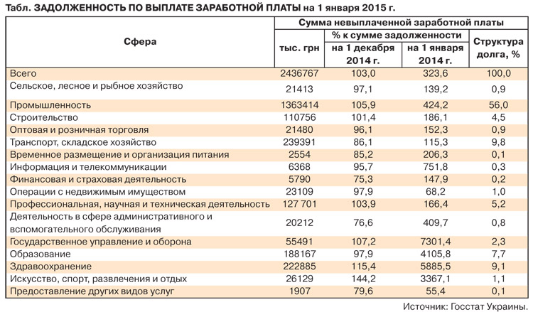 Почти 2,5 млрд грн недополучили украинцы причитающейся им оплаты труда на начало 2015 г. Цифра пугающая - за минувший год задолженность по заработной плате увеличилась без малого в три раза, а количество тех, кто не получает зарплаты, выросло до 382 тыс. человек. Рады бы чиновники и это списать на войну, да вот одним Донбассом проблема не ограничилась, задолженности фиксируются во всех без исключения областях (!).