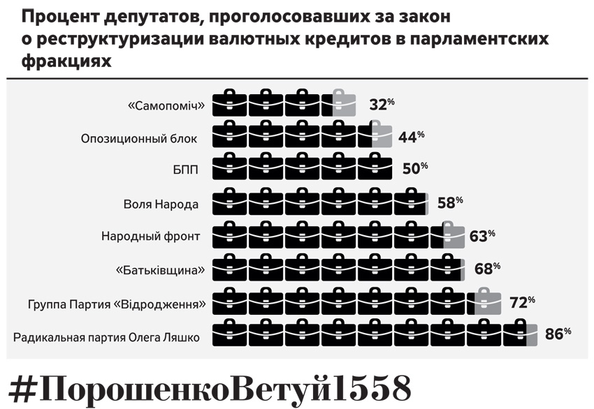 Но депутаты, проголосовавшие за закон №1558-1, ни об этом, ни об остальных последствиях не думают. Для них важна популярность, причем как среди тех, кто занял в валюте, так и среди тех, кто будет за эти займы платить. Сейчас они вовсю пытаются сплясать и вашим, и нашим, начиная отзывать свои голоса, прося председателя ВР закон не подписывать, а президента, в случае чего, его ветировать. Вот только Владимир Гройсман сам голосовал за закон №1558-1, как и 72 из 106 присутствовавших на заседании депутатов фракции "Блок Петра Порошенко". В итоге и спикер, и президент могут и должны спасти ситуацию, только героями они уже не будут. Возможность для демонстрации взвешенной и осмысленной позиции фракцией безвозвратно утрачена, партия власти уже продемонстрировала полную безалаберность, и неприятный осадок останется даже в случае президентского вето.