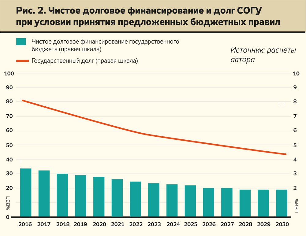 Можно предложить и альтернативный, более жесткий вариант, предусматривающий, что в случае превышения государственным долгом 33% ВВП объем чистого долгового финансирования государственного бюджета не может превышать 50% расходов на обслуживание государственного долга. При соблюдении указанного бюджетного правила уровень долга СОГУ в 2030 г. может снизиться до 44% ВВП.