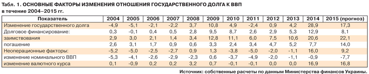 Основными причинами роста уровня государственного долга в Украине на протяжении 2014–2015 гг. являются значительные объемы долгового финансирования, вследствие которого уровень госдолга увеличится на 21% ВВП. Кроме этого, в результате изменения валютного курса уровень государственного долга повысится еще на 34% ВВП. Настолько значительное влияние последнего фактора свидетельствует о недооценке валютных рисков и необходимости внесения изменений в Бюджетный кодекс, которые, по возможности, ограничивали бы долю госзаимствований в иностранной валюте.