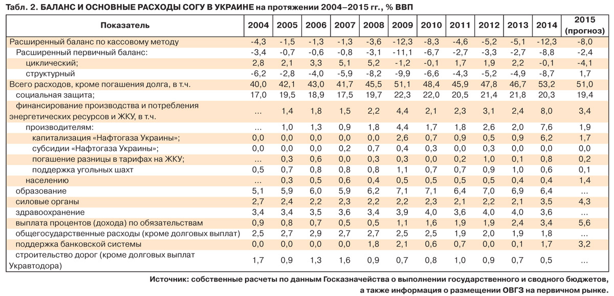 На период проведения реформ и стабилизации экономической и политической ситуации ведущие страны мира вместе с международными финансовыми организациями предложили Украине выгодные условия финансирования с четким требованием консолидировать госфинансы и уменьшить долговую нагрузку. В условиях сверхвысоких (не связанных с погашением долговых обязательств) расходов СОГУ, которые в 2014 г. достигли 53,2% ВВП (также самый высокий показатель со времени обретения Украиной независимости, см. табл. 2), у правительства не было другой альтернативы, кроме как запланировать резкое ограничение практически всех статей расходов, не связанных с погашением долга, - до 51% ВВП. Такие меры позволили запланировать снижение расширенного баланса СОГУ с -12,3 до -8,0% ВВП. Об усилении фискальной политики свидетельствует запланированный первичный структурный баланс СОГУ (считающийся традиционным показателем усилий правительства по сбалансированию государственных финансов) с профицитом на уровне 1,7% ВВП, тогда как в 2014 г. структурное сальдо было отрицательным и составляло -8,7% ВВП.