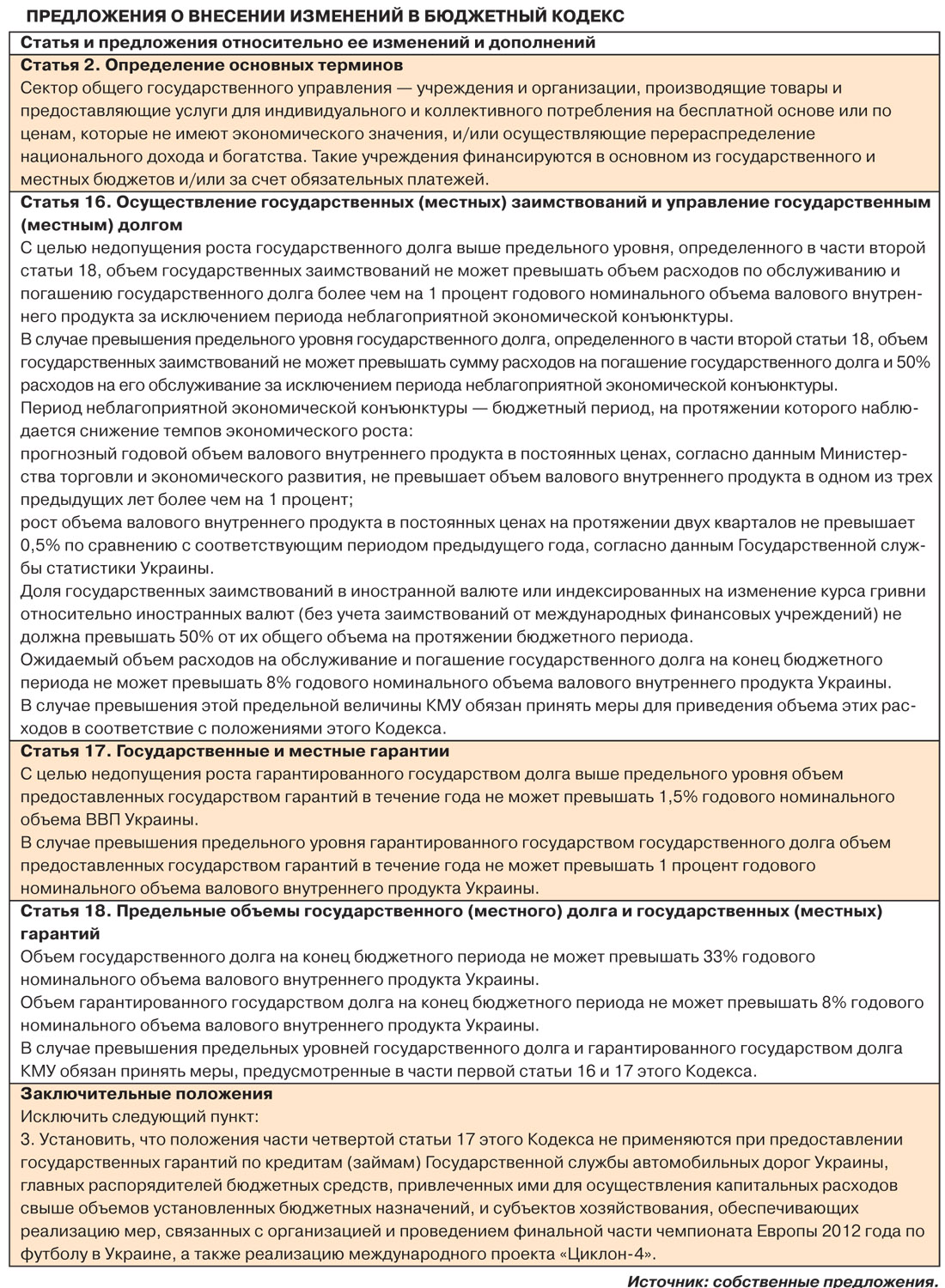 В июле Минфин Украины обнародовал проект закона "О внесении изменений в Бюджетный кодекс Украины (относительно бюджетных правил о внесении изменений в бюджет)", предусматривающий условия, которые делают возможным внесение изменений в закон о государственном бюджете на протяжении бюджетного периода, без согласования с КМУ. Последний, в свою очередь, имеет право принимать решения, предполагающие изменение предельного размера дефицита государственного бюджета, предельного объема государственного долга, гарантированного государством долга и предельного объема предоставления государственных гарантий.