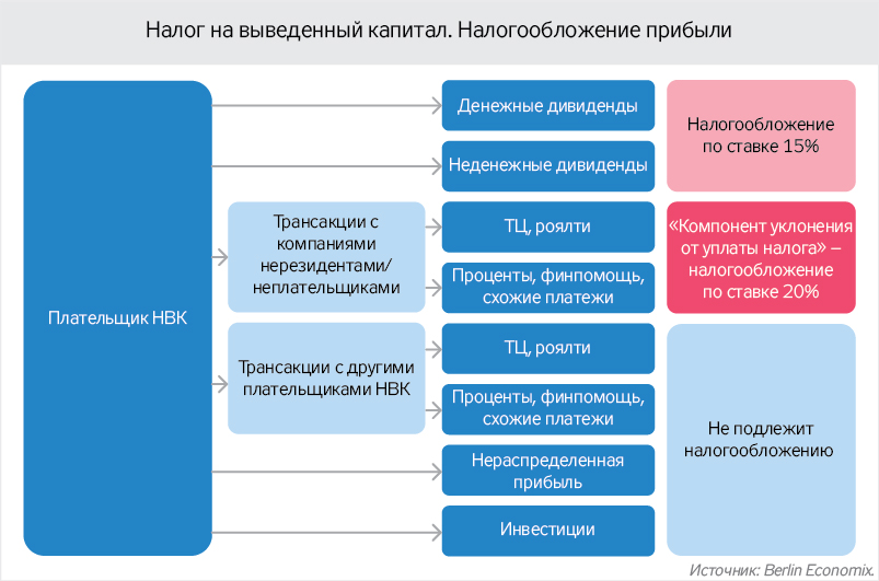 Предложенный взамен налога на прибыль налог на выведенный капитал предусматривает изменение базы налогообложения на трансакции, предполагающие вывод капитала из налоговой системы. Согласно проекту закона о НВК такие трансакции будут облагаться налогом по ставке 15% для дивидендов и 20% для других, "рисковых", форм вывода капитала, например, завышение трансфертных цен или индексация процентных ставок по кредитам от связанных лиц. Эта система существенно отличается от действующей системы налога на прибыль, поскольку базой налогообложения становятся трансакции с неплательщиками НВК, а комплексную базу на основании финансовой отчетности вообще перестают учитывать.