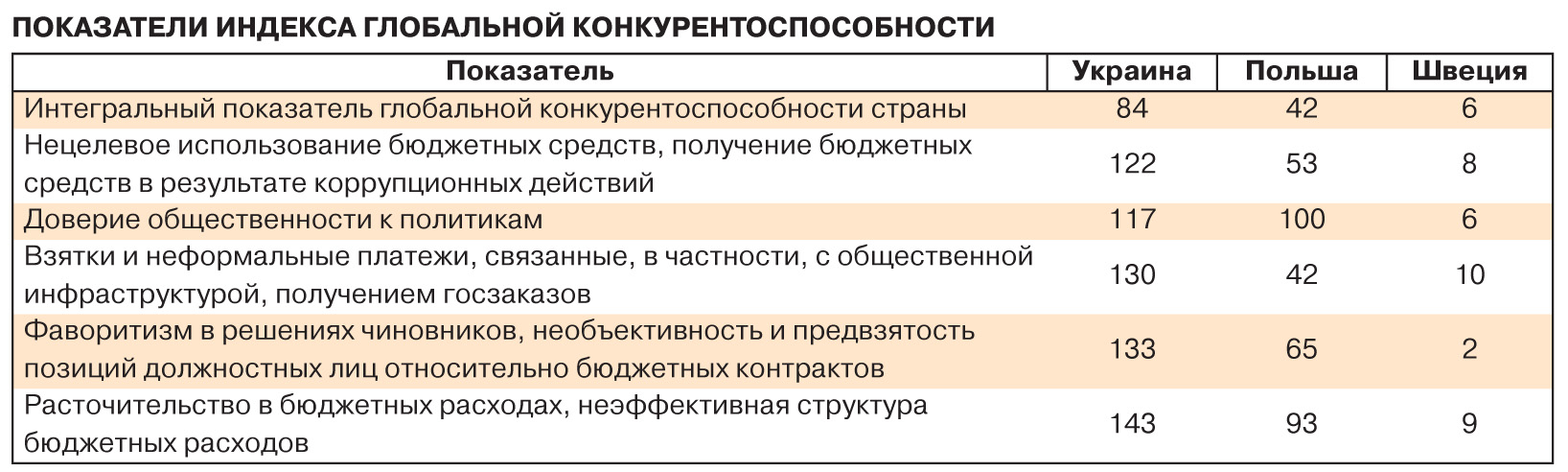 Весомыми факторами риска для формирования бюджетных решений и, соответственно, для состояния бюджетной системы Украины являются, в частности, нецелевое использование бюджетных средств, высокая коррупционная составляющая бюджетных расходов и их неэффективная структура. Это отражается местом стран по показателям рейтинга глобальной конкурентоспособности Всемирного экономического форума (см. табл. на сайте ZN.UA).
