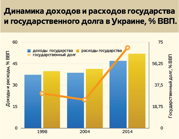 2004 г. и приблизительно 38% ВВП в 2012 г., а государственные расходы - с 60 до 52% ВВП (см. рис.). Отсутствие таких процедур в Украине приводит к непрерывному росту как расходов сектора общего государственного управления, так и государственного долга.