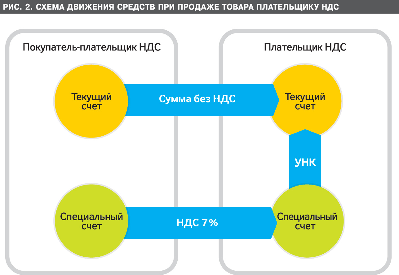 В дальнейшем производитель продает свой товар плательщику НДС. В этом случае он (уже продавец) получает оплату стоимости товара на свой счет без НДС и оплату налога - на свой спецсчет (Рис. 2. Схема движения средств при продаже товара плательщику НДС).