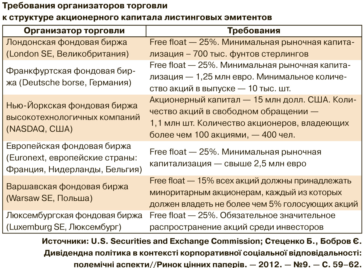 5. В Украине эмитенты не выполняют стандартные требования о прозрачности и подотчетности обществу, а также финансово-инвестиционной среде. Отсутствуют антимонопольные меры на рынке ценных бумаг, что регулировало бы минимальный free float (количество акций в свободном обращении на фондовом рынке) для компаний, торгующих на фондовой бирже. Так, по международным стандартам, free float должны находиться на уровне от 15–25% (см. табл.).
