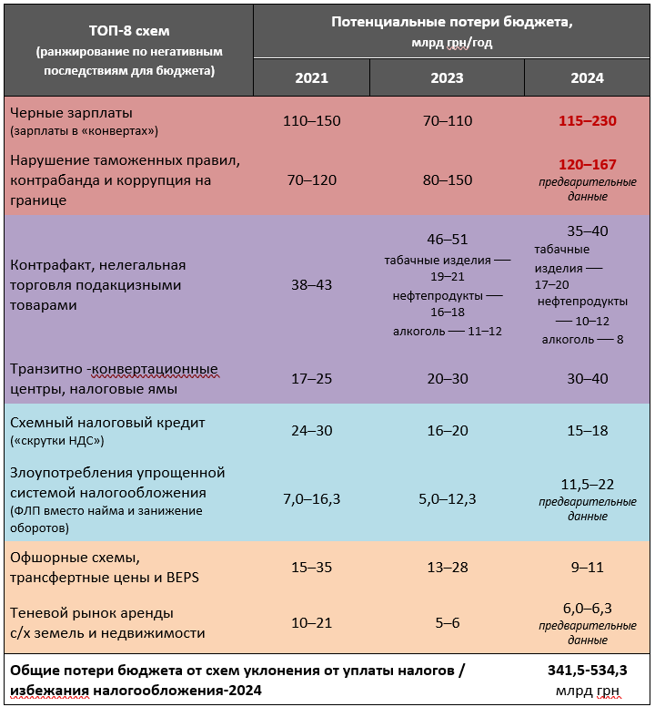 Макроэкономический масштаб самых распространенных схем уклонения от уплаты налогов поражает, потому что достигает по обороту более 1,3 трлн грн в год, или 17,4% от официального ВВП страны. Часть схем успешно развивается и растет, часть удалось минимизировать на протяжении последних лет. Лидерами являются «контрабанда и злоупотребления на границе», а также «зарплаты в конвертах» (потери бюджета — соответственно 120–167 млрд и 115–230 млрд грн в год).