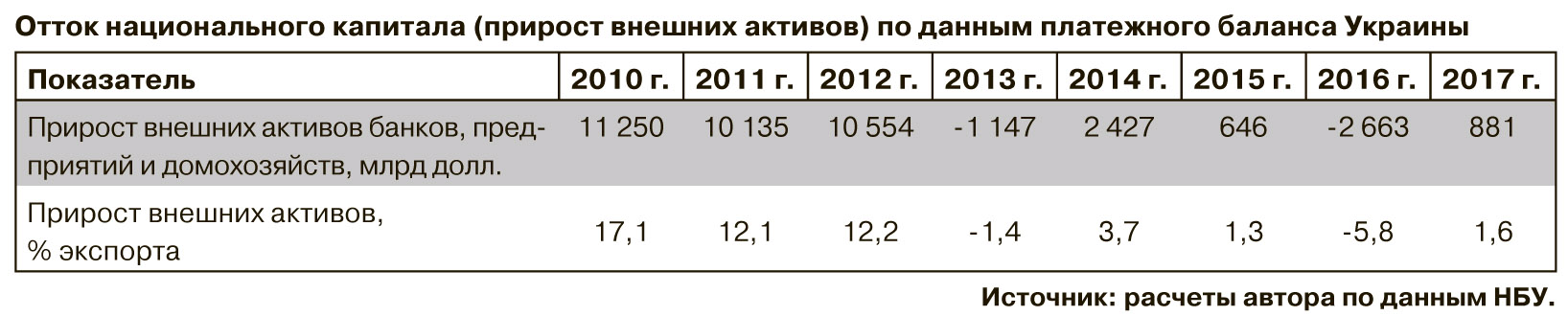 Для оценки потенциальных объемов оттока национального капитала из Украины при либерализации валютного режима были обобщены фактические данные платежного баланса по приросту внешних активов за 2010–2017 гг. (см. табл.). Оказалось, что в период отсутствия кризисных потрясений в Украине при действии ограничительного режима валютного регулирования объемы накопления внешних активов банков, домохозяйств и предприятий составляли около 10 млрд долл. в год, или 12% экспорта товаров и услуг. Вместе с тем, например, в России (в которой трансграничное движение капиталов было либерализовано в 2006 г.) в 2011–2014 гг. аналогичный показатель составлял 20,1–28,2% экспорта. В последние годы в Украине прирост внешних активов банков, домохозяйств и предприятий был незначительным и не превышал 0,9 млрд долл. Однако в перспективе при стабилизации экономической ситуации в стране и отсутствии каких-либо ограничений для зарубежных вложений резидентов прирост внешних активов может увеличиться до 10–12 млрд долл. в год.