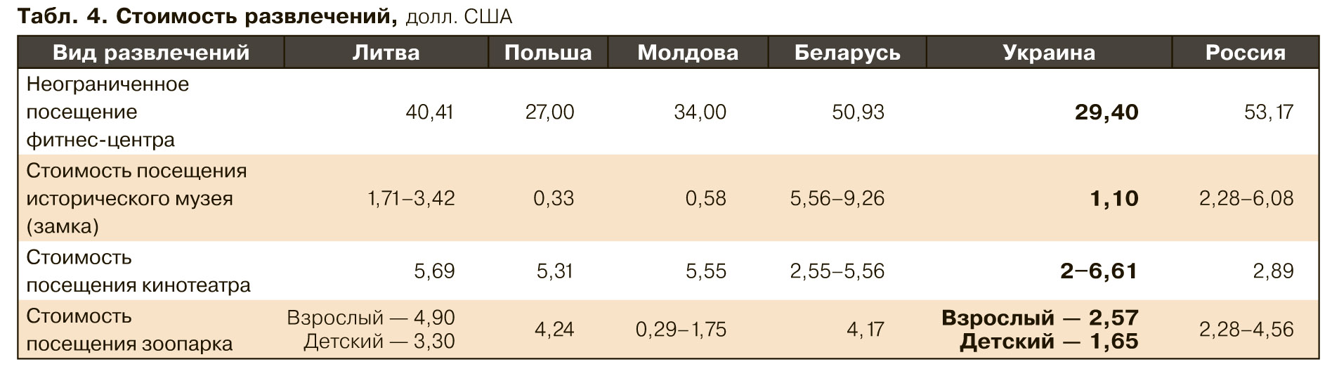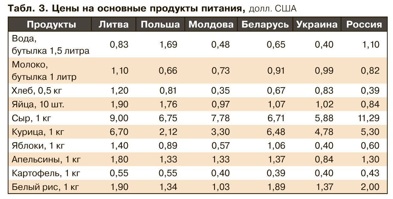 В табл.3 приведены цены на продукты базового набора в разных странах, конечно, в долларах США. А в табл. 4, помня о том, что не только хлебом насущным жив человек, указана стоимость некоторых развлечений, которые периодически может себе позволить среднестатистическая семья.