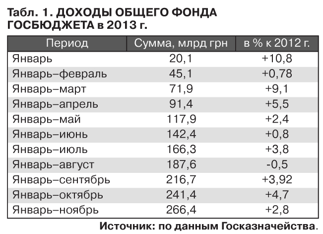 По данным Госказначейства, за январь-ноябрь доходы госбюджета по сравнению с этим же периодом 2012 г. выросли на 1,04%, до 308,7 млрд грн, по общему фонду - 266,4 млрд грн., или плюс 2,8%. С сугубо бюджетной точки зрения этот результат, возможно, не так плох, если учитывать сокращение экономики, однако он не дотягивает до "космического" роста почти на 7 и 12%, которые заложены в действующей госсмете.