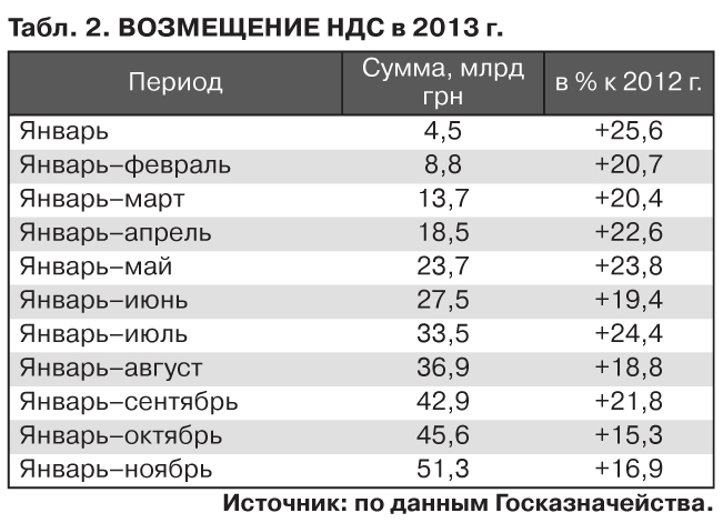 Не исключено, что, чтобы свести концы с концами, правительство может попытаться применить такой рычаг (неоднократно апробированный в бюджетной истории Украины), как уменьшение возмещения НДС. Здесь запас прочности есть. По итогам 11 месяцев возврат налога вырос на 7,4 млрд грн, или на 16,9%, по сравнению с этим же периодом 2012-го - до 51,3 млрд грн (из них "автоматом" - 21,8 млрд грн; ежемесячно достаточно стабильно - около 2 млрд). Кстати, этот рост наблюдается, несмотря на экономическую и бюджетную ситуацию. Хотя, по крайней мере, частично это можно объяснить сокращением висящих годами старых долгов, спешкой перед все еще возможным выпуском казначейских векселей и т.д.