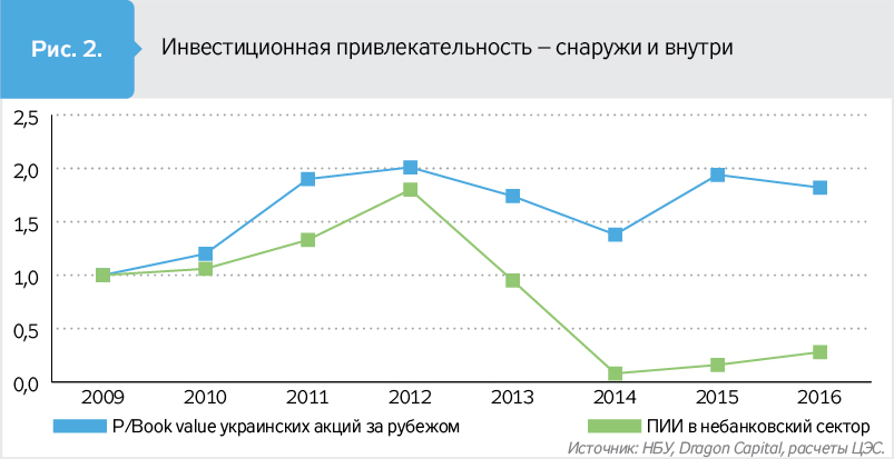 Настоящие гарантии прямым инвесторам нужно внести в закон. Прямые инвестиции не будут заходить в Украину, пока есть ограничения. Это четко прослеживается, если сравнить, как менялась стоимость украинских акций за рубежом, где нет ограничений, и объемы прямых инвестиций в Украину, где ограничения есть, а все остальные риски остаются такими же (см. рис. 2). Даже нереформированная Украина ежегодно теряет 50–80% потенциального объема прямых иностранных инвестиций только из-за ограничений.