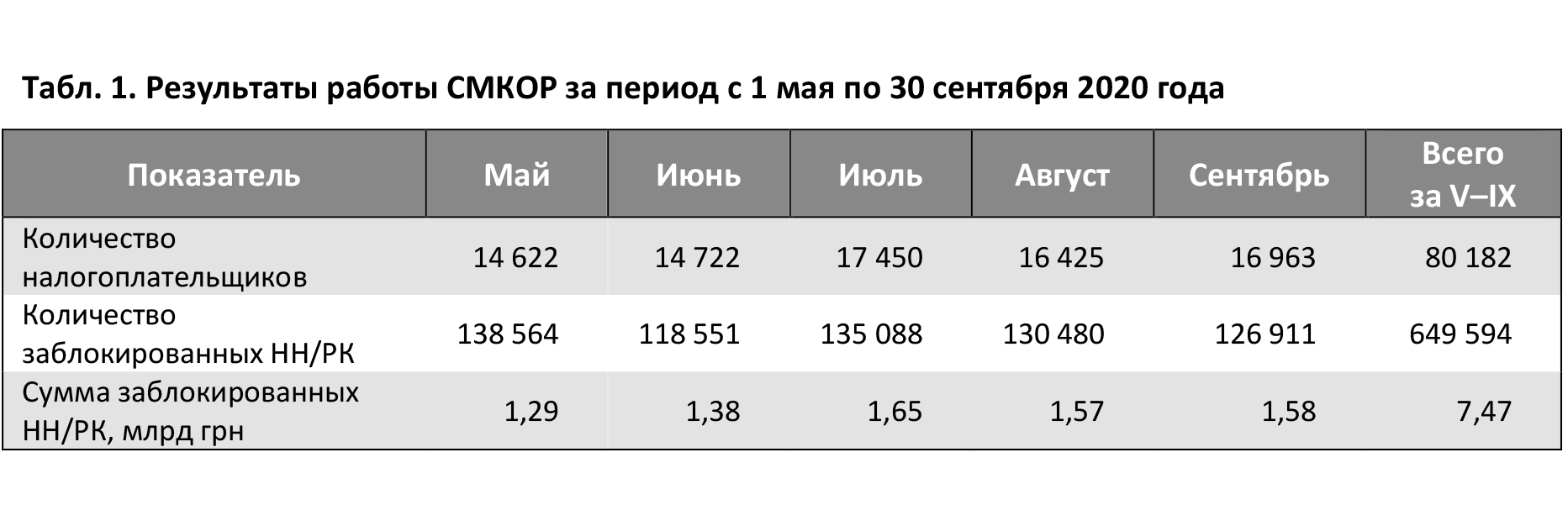 В течение мая—сентября текущего года от блокировок (нарастающим итогом) пострадали 80,2 тысячи плательщиков НДС, была остановлена регистрация 649,6 тысячи налоговых накладных/расчетов корректировок (НН/РК) на общую сумму 7,47 млрд грн (см. табл. 1).
