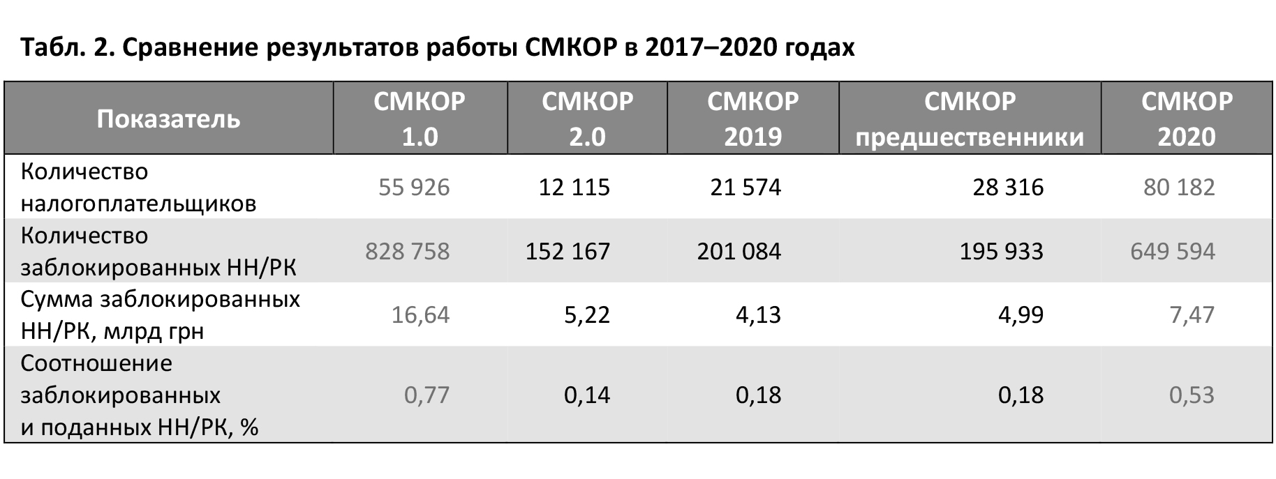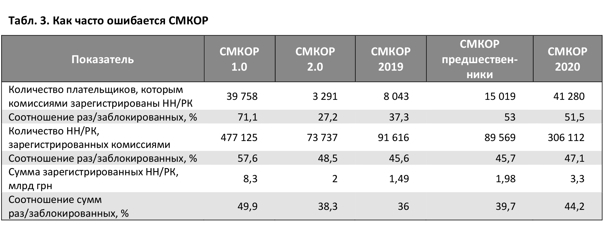 - несмотря на несколько усовершенствований (апгрейды 2018-го и 2020-го), система не стала ни справедливее, ни эффективнее. Перепроверка автоматизированных блокировок, кроме того, что таковая сама по себе является опасным коррупциогенным фактором, выявила, что практически каждая вторая налоговая накладная блокируется безосновательно. Для примера, в период кризиса (с марта по сентябрь 2020 года) по «неубедительным» основаниям у налогоплательщиков были остановлены хозяйственные операции на сумму 4,34 млрд грн (и это признали комиссии налогового органа);